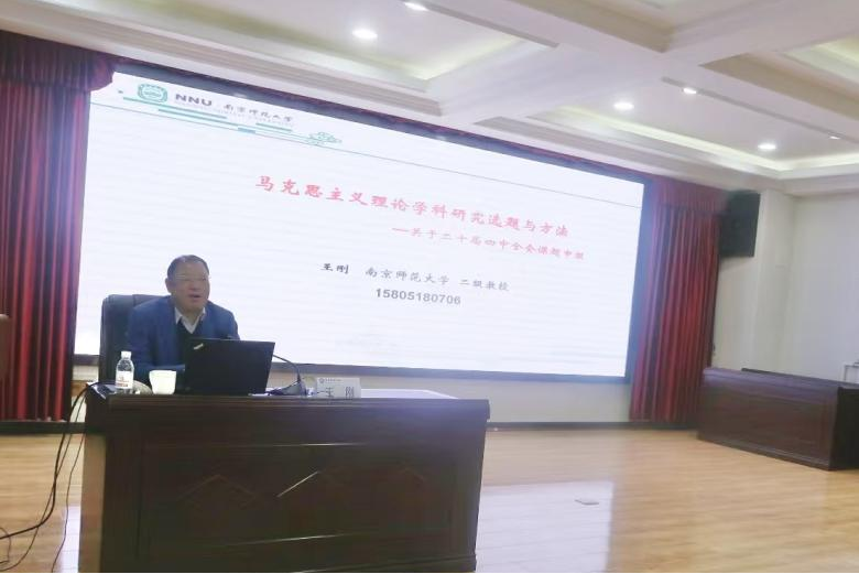 12月9日上午,学院特邀南京师范大学教授王刚作题为《马克思主义理论学科研究选题与方法——关于党的二十届四中全会课题申报》辅导报告。马克思主义学院党政领导班子成员出席会议,全体师生参会。会议由青岛科技大学马克思主义学院院长曹胜主持。