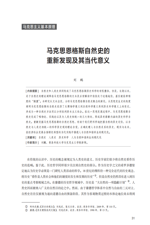 关键词:自然史;人类史;历史科学;人与自然和谐共生的现代化