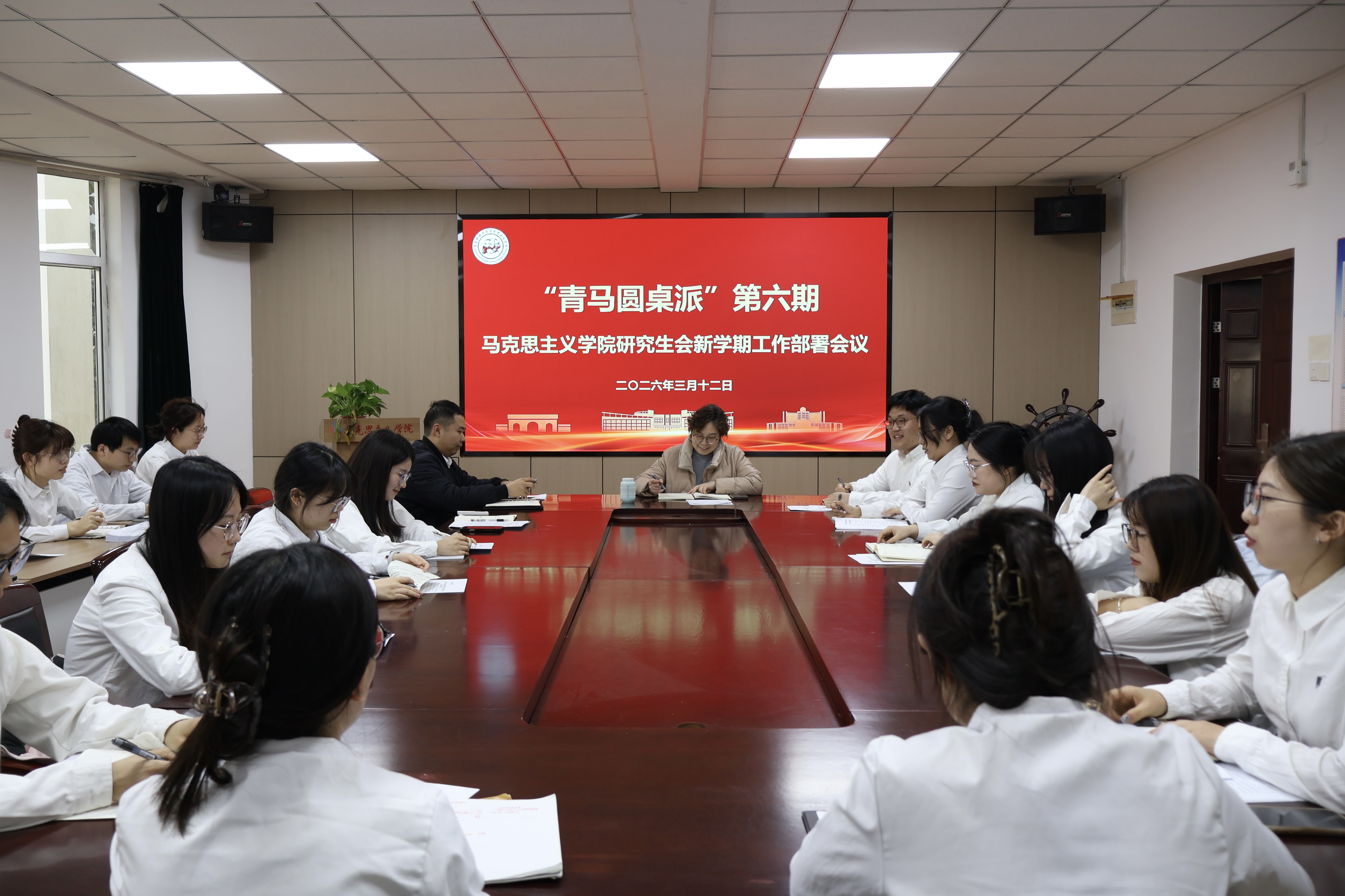 3月12日下午,“青马圆桌派”第六期——马克思主义学院研究生会新学期工作部署会议于学院2010会议室举行。马克思主义学院党委书记李卉出席会议并作指导,研究生会各部门负责人及2025级研究生骨干代表参加会议,会议由研究生会执行主席王靖森主持。