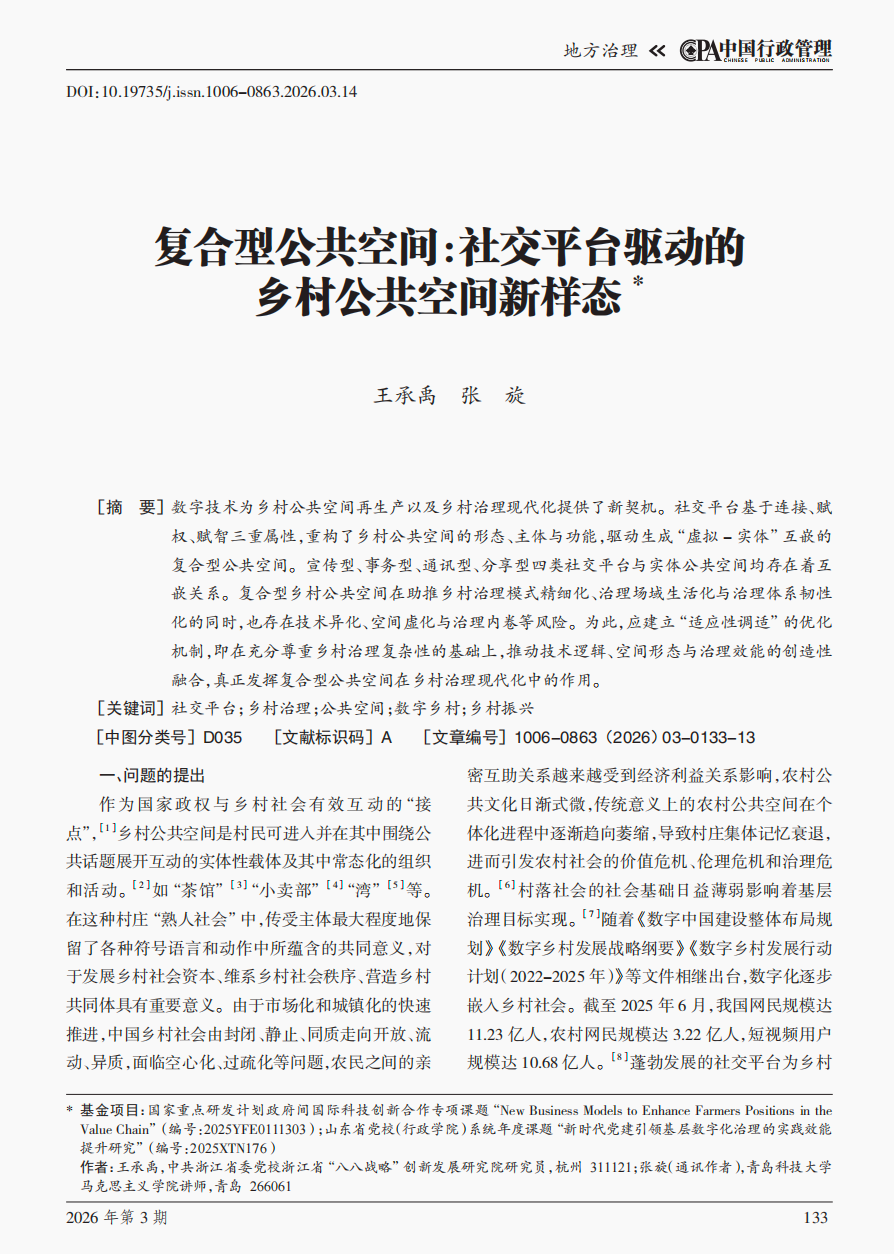 近期,我院张旋老师作为通讯作者撰写的学术论文《复合型公共空间:社交平台驱动的乡村公共空间新样态》在CSSCI来源期刊《中国行政管理》2026年第3期发表。文章旨在探讨社交平台对乡村公共空间的重构机理,阐明被重构的数字公共空间反哺治理实践的内在逻辑,进而以有效的空间治理驱动有效的乡村治理。