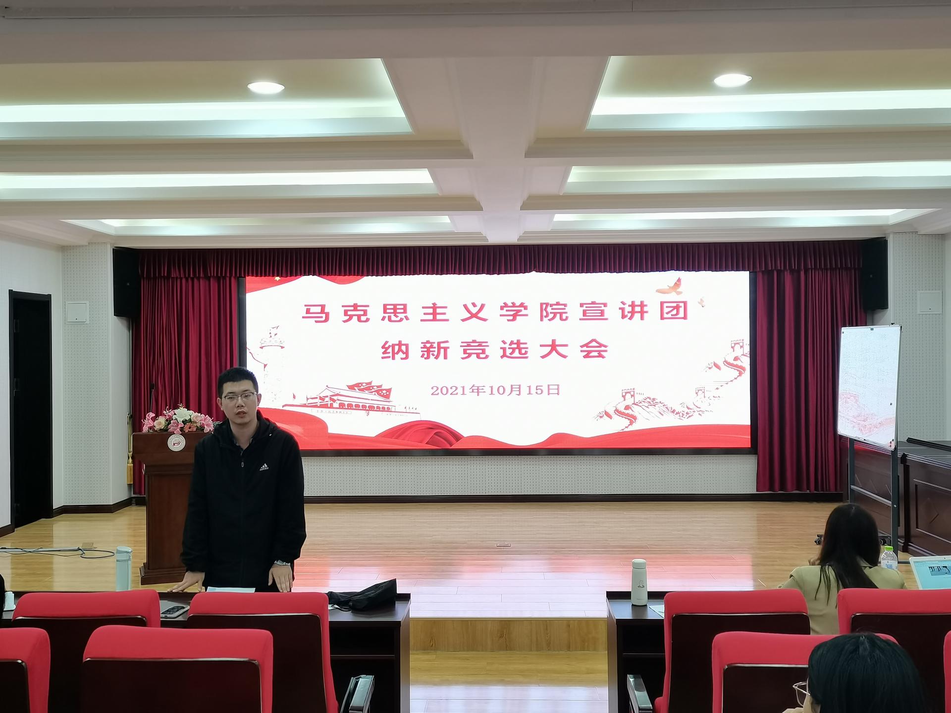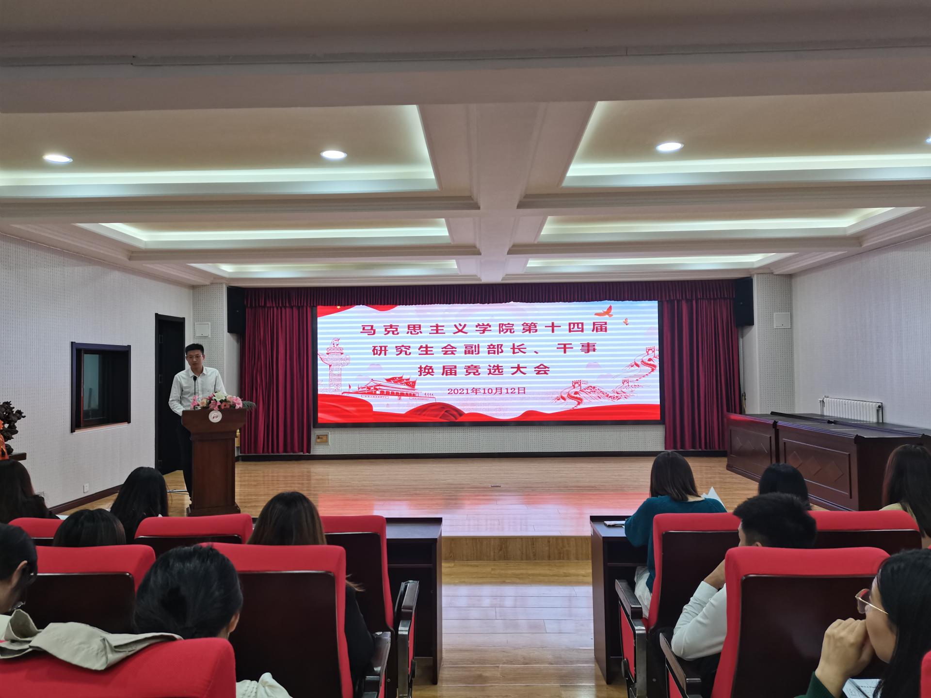 2021年10月15日下午,马克思主义学院在学院报告厅举行第十四届研究生会副部长、干事换届竞选暨第四届宣讲团纳新大会。研究生辅导员车舒雨、2020级班主任孙倩倩、第三届宣讲团团长徐圣权及第十四届研究生会主席团成员、各部部长参加此次活动。本次活动由第十四届研究生会主席王宇主持。