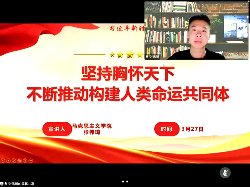 张伟琦以构建人类命运共同体为切入点,立足回答时代之问:“世界怎么了、我们怎么办?”引导大家积极思考,站在新的历史起点上,用“坚持胸怀天下”这一宝贵经验,朝着构建人类命运共同体方向不断迈进。探索共建共享之道,推动历史车轮向着光明的前途前进。