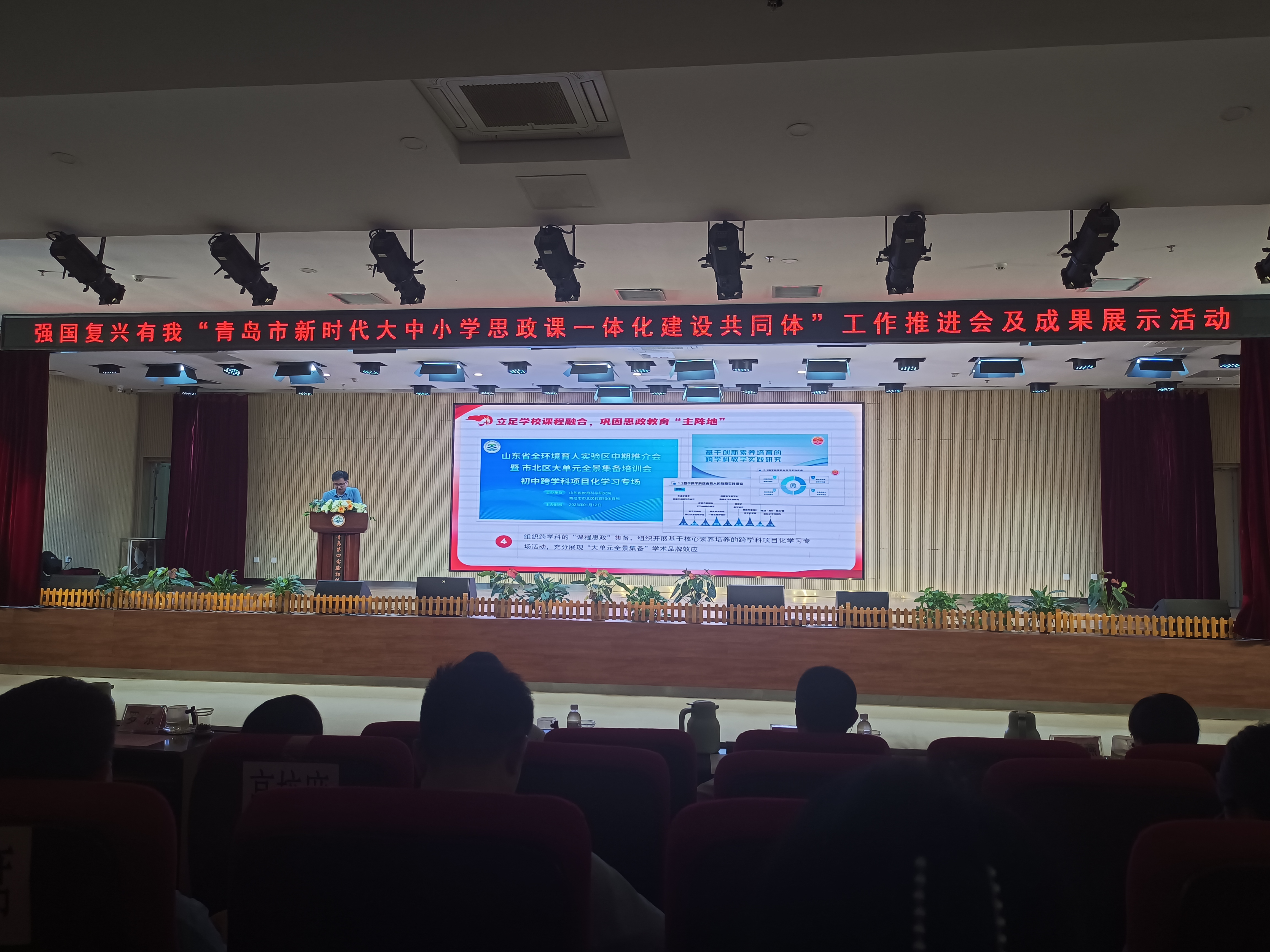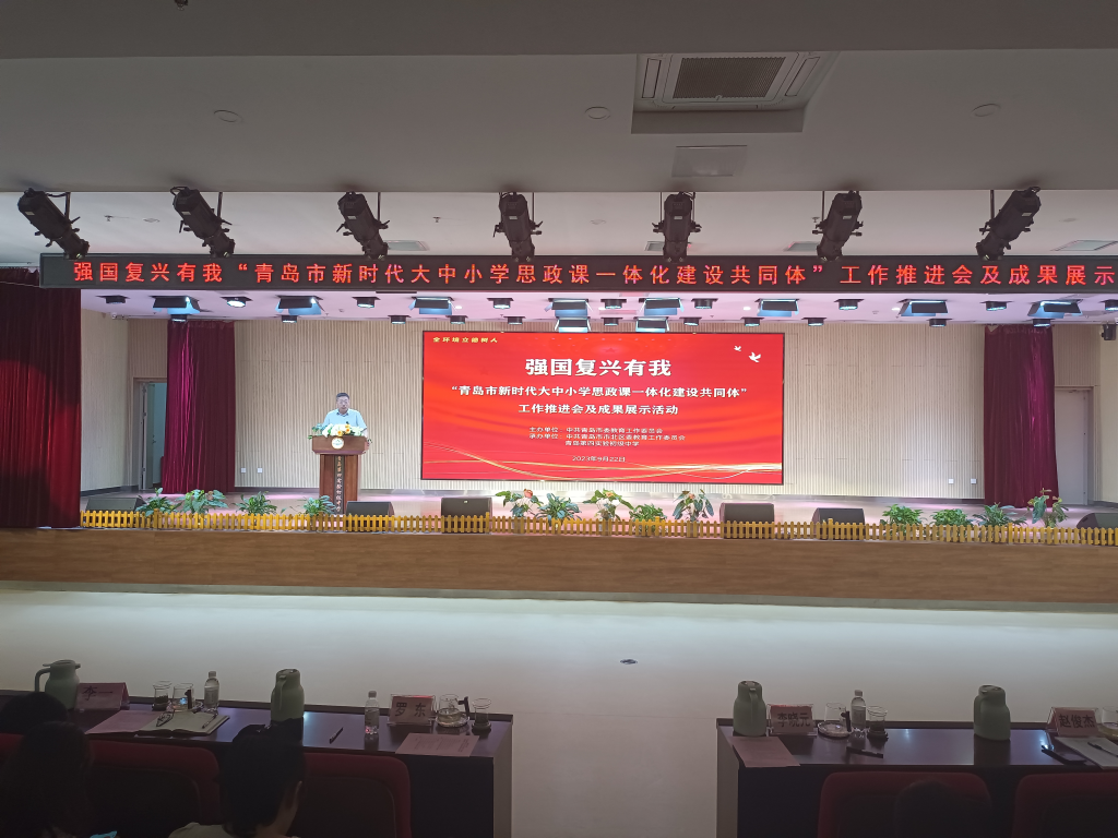 为扎实推进青岛市大中小学思政课一体化建设,全方位多视角展示各“共同体”在课题研究、教育教学、实践活动和师生交流等方面的建设成果,9月22日下午,由中共青岛市委教育工作委员会主办,中共青岛市市北区委教育工作委员会与青岛第四实验初级中学承办的强国复兴有我“青岛市新时代大中小学思政课一体化建设共同体”工作推进会及成果展示活动在青岛第四实验初级中学举行。市委教育工委(市教育局)领导及相关处室负责人,各区、市党委教育工委(教体局)分管领导及相关科室负责人以及在青高校马克思主义学院院长(思政部)分管领导等参加此次活动。