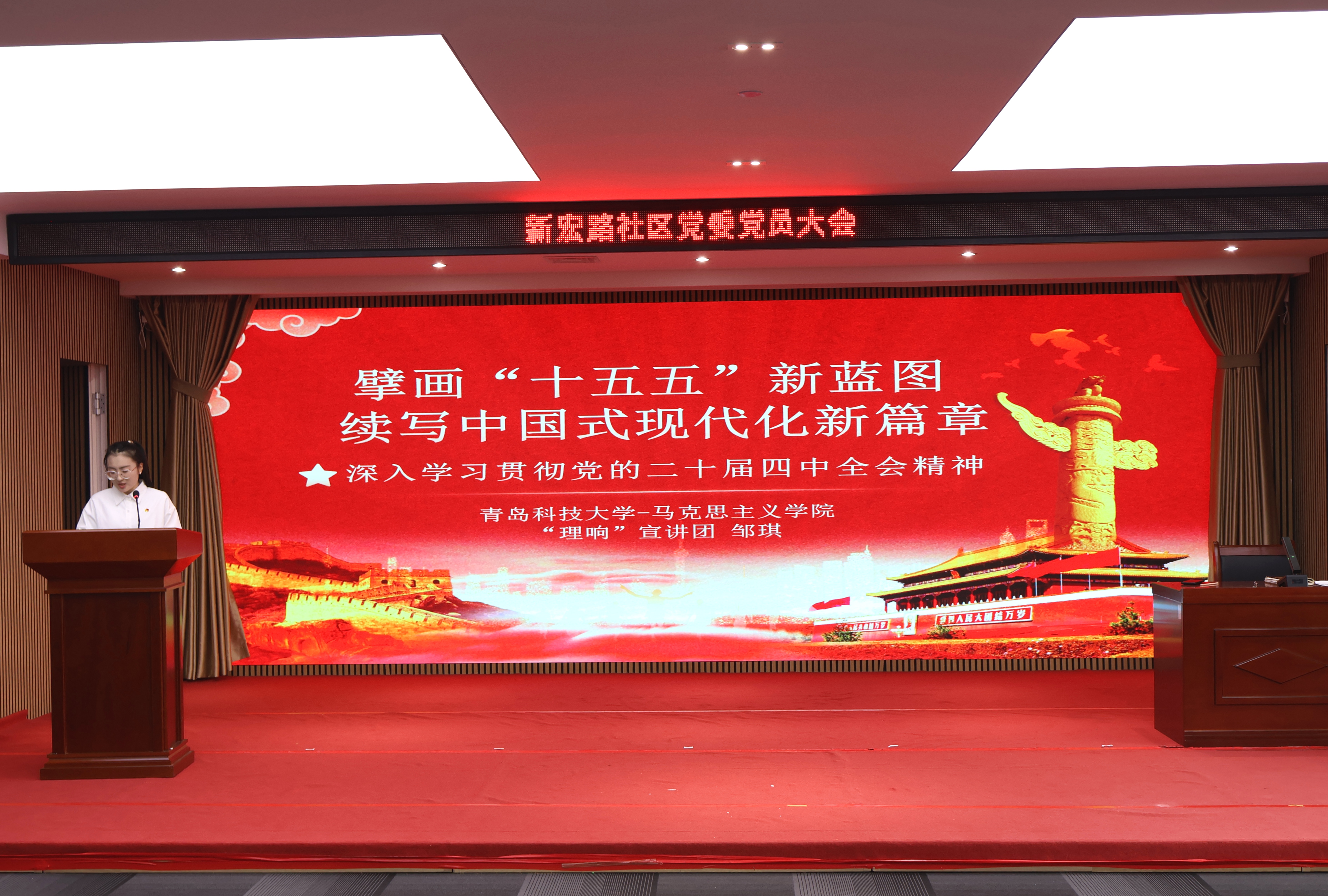 11月16日,马克思主义学院“理响”宣讲团走进新宏路社区,开展学习贯彻党的二十届四中全会精神专题宣讲活动。社区党员干部、居民代表参加。