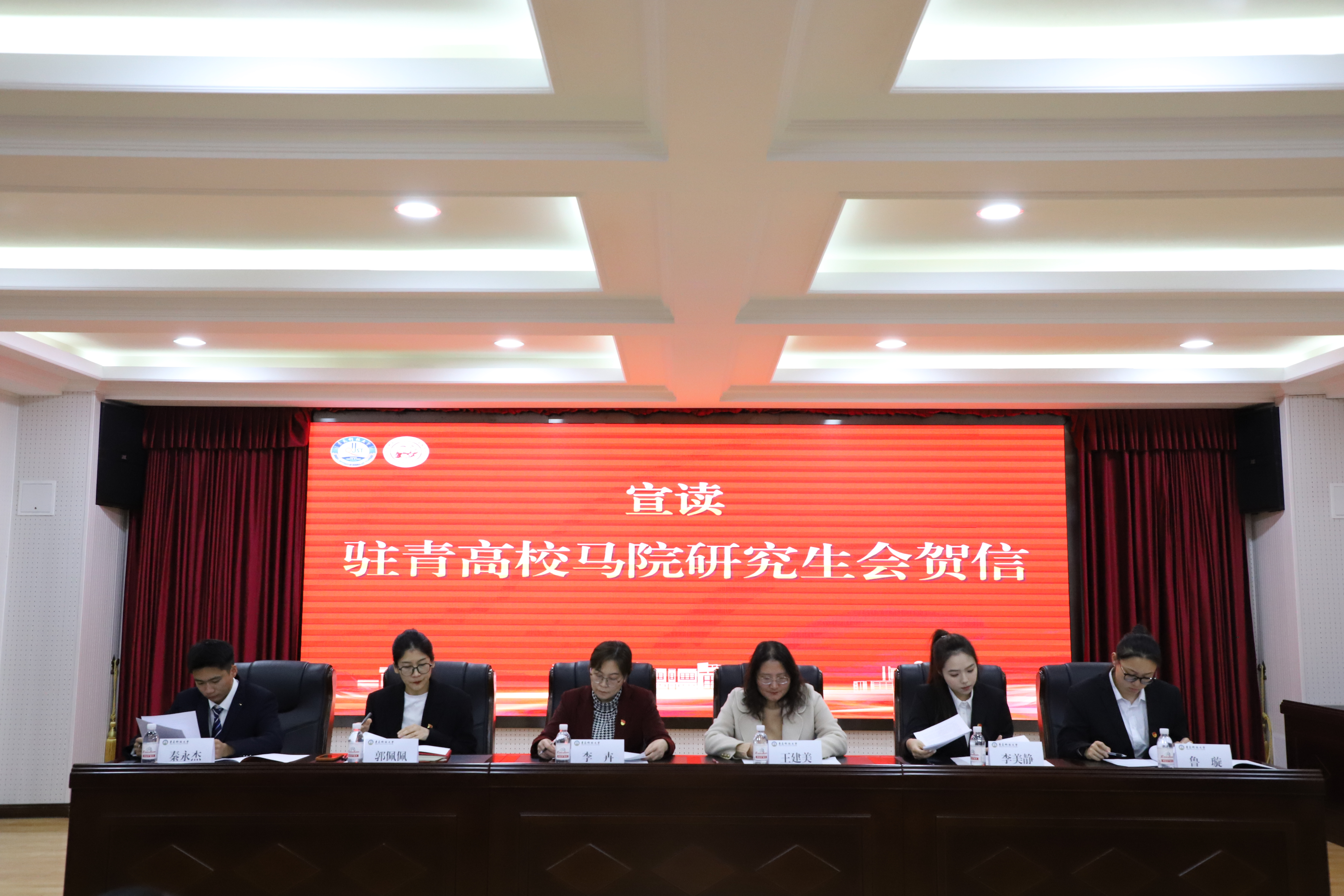 随后,工作人员宣读驻青高校马克思主义学院研究生会发来的贺信。各驻青高校马院对学院第七次研究生代表大会的顺利召开致以最热烈的祝贺,高度肯定了学院研究生会在学术交流、思想引领、服务同学等方面的工作成效,并表达了未来进一步深化院际协作的殷切期望,携手为实现中华民族伟大复兴的中国梦贡献青春智慧与磅礴力量。