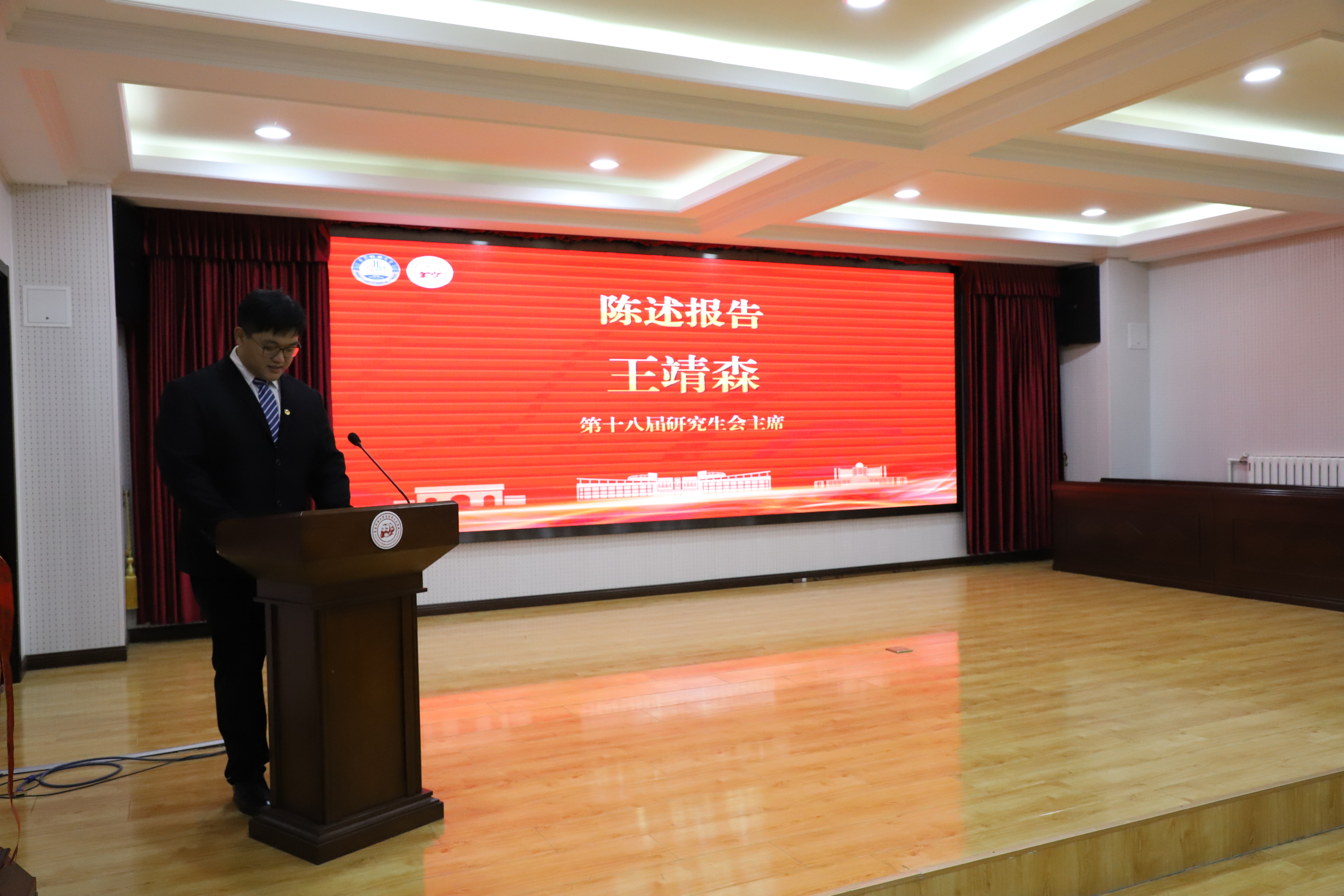 第十八届研究生会执行主席王靖森代表新一届成员作报告,他表示将带领团队坚守服务宗旨,创新工作方法,提升工作质效,不辜负学院与同学们的信任。