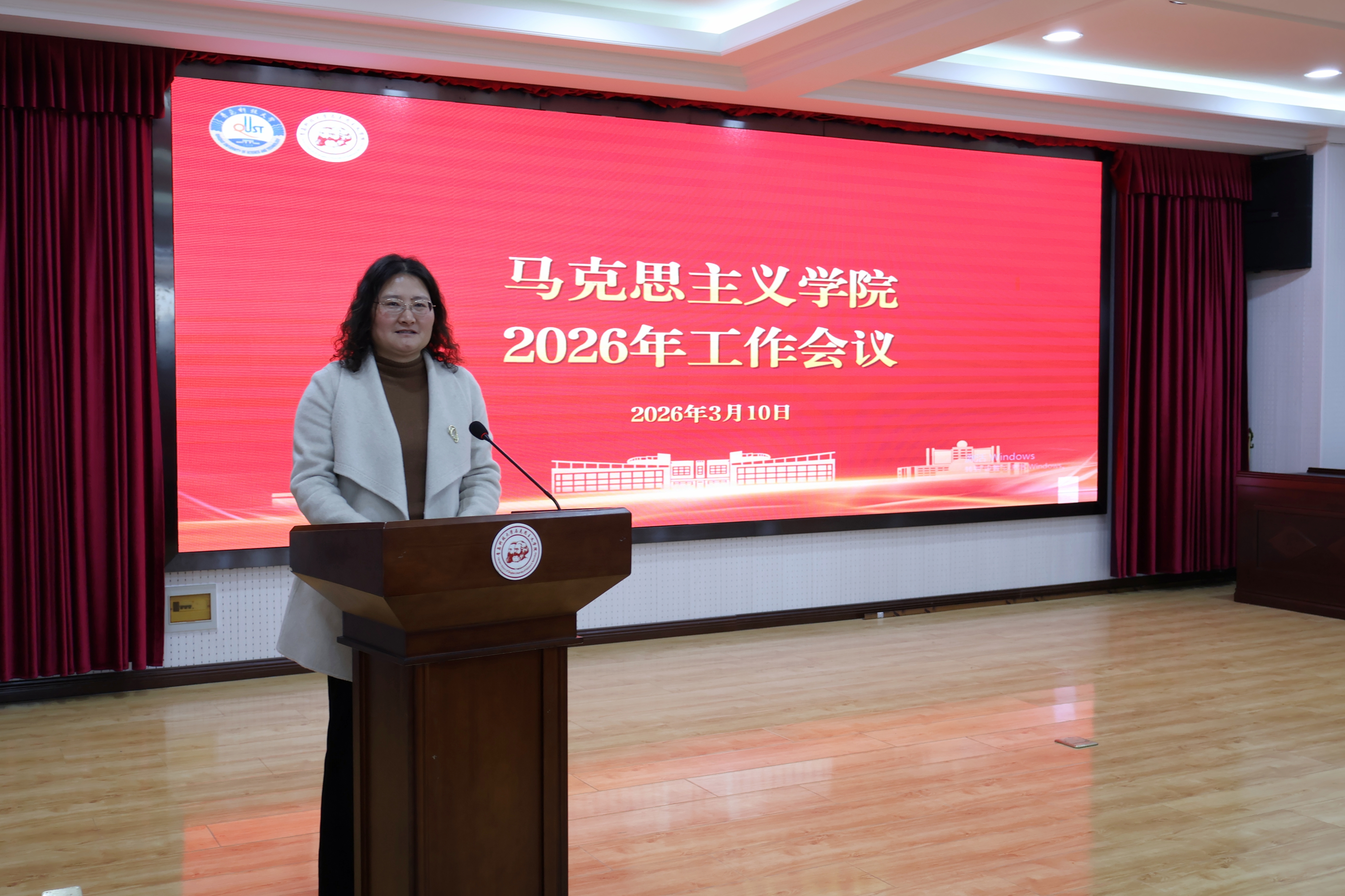 3月10日下午,马克思主义学院在学术报告厅召开2026年工作会议。学院党委书记李卉、院长曹胜、学院领导班子成员及全体教职工参加。会议由李卉主持。