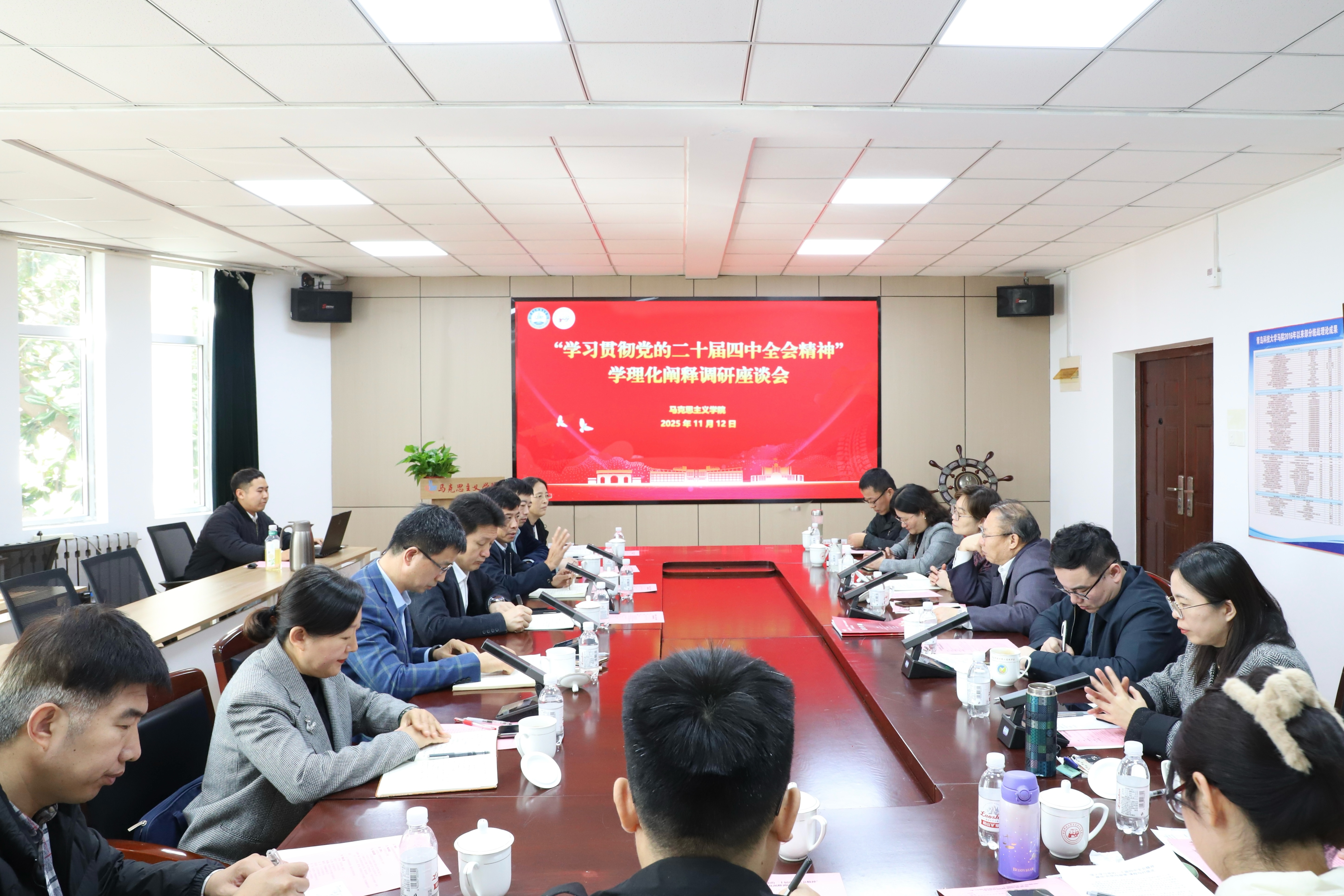 11月12日上午,马克思主义学院于2010会议室召开“学习贯彻党的二十届四中全会精神”学理化阐释调研座谈会,青岛科技大学党委常委、副校长吴明铂,人文社科处处长杨友才,图书馆党委书记王士卿,马克思主义学院院长曹胜,发展规划与学科建设处副处长杨晶巍,学报编辑部副主任戴尊红,人文社科处副处长汪洋、范延安,马克思主义学院副院长郭江龙、王建美出席,马克思主义学院各教研室教师代表参加会议。会议由马克思主义学院党委书记李卉主持。