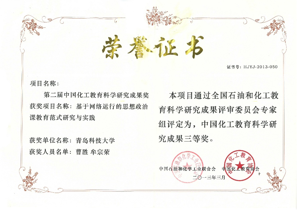 2013年度中国化工教育科学研究成果三等奖:基于网络运行的思想政治课教育范式研究与实践