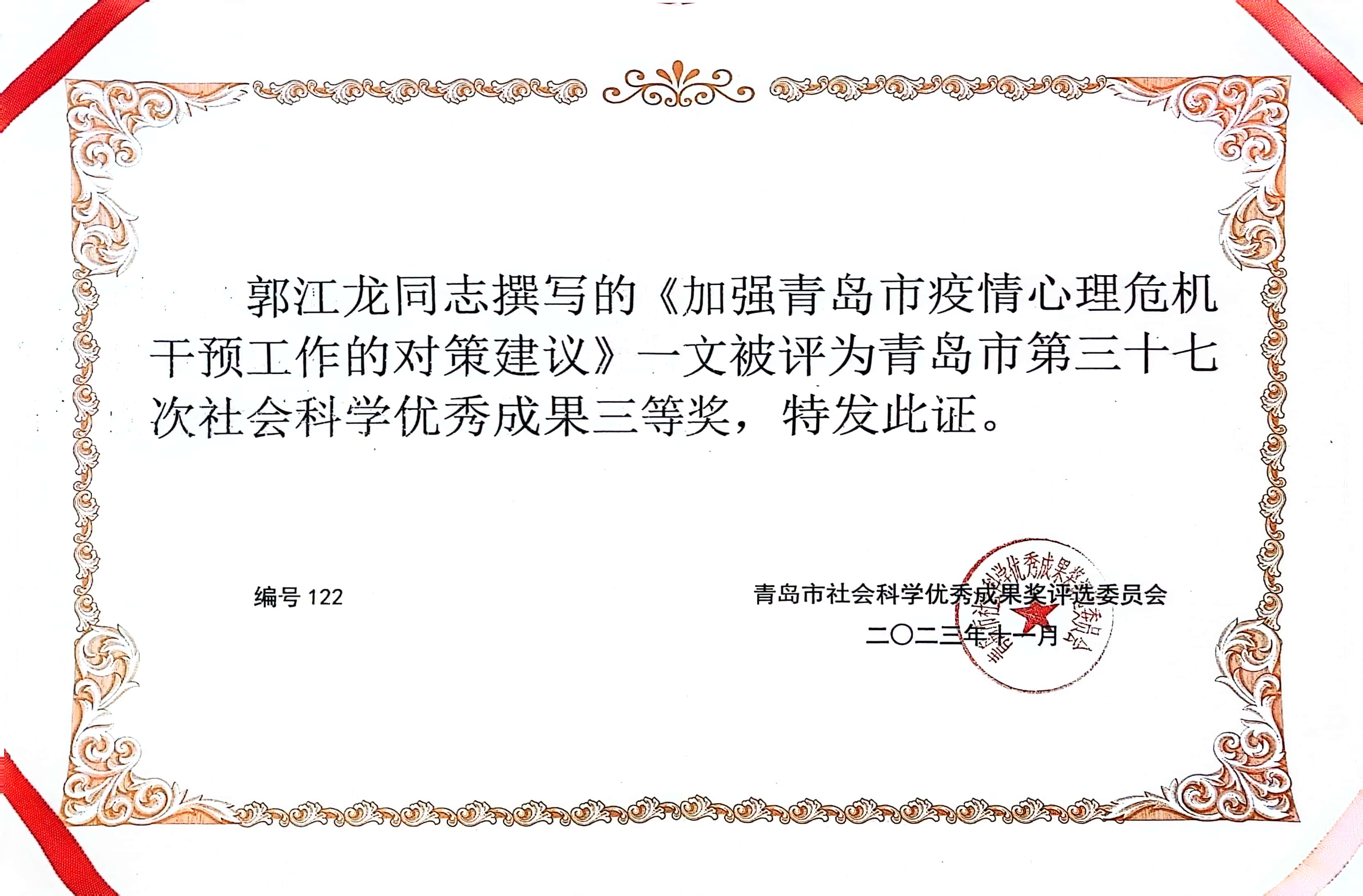 青岛市第三十七次社科优秀成果三等奖:郭江龙