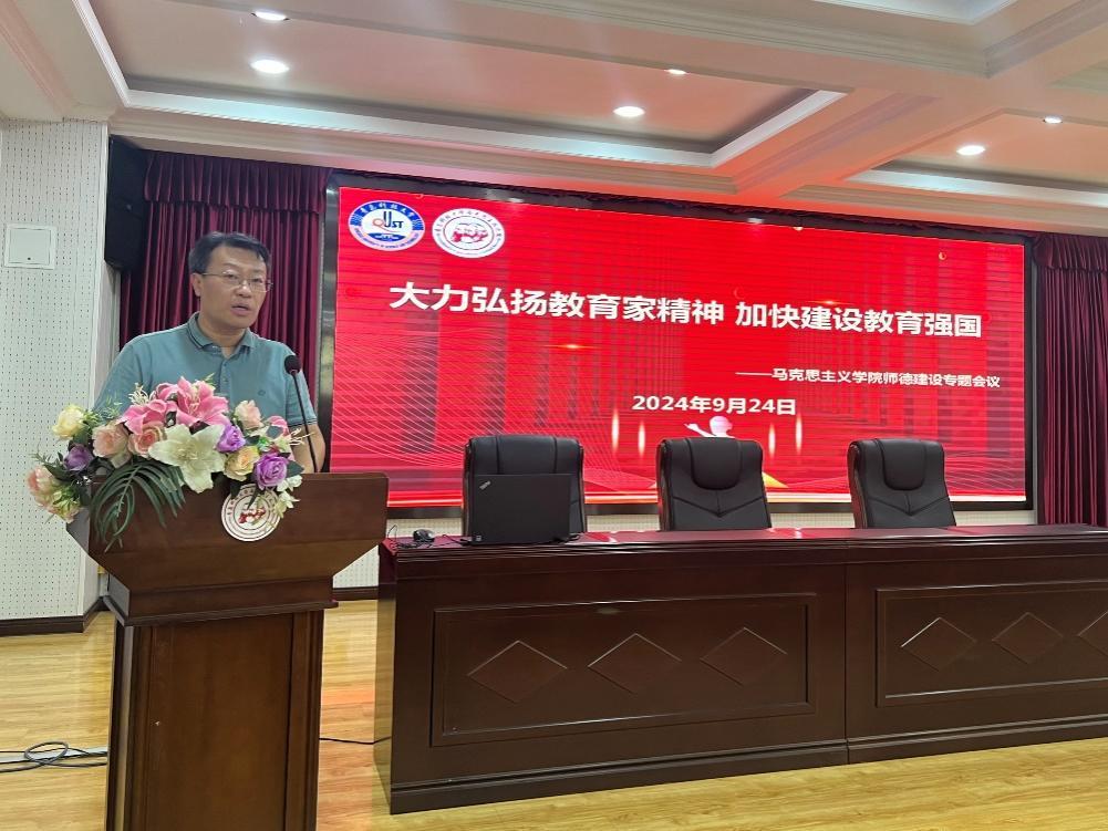9月24日,青科大马克思主义学院于学术报告厅举办“大力弘扬教育家精神 加快建设教育强国”师德师风建设专题会议。为深入学习贯彻党的二十届三中全会精神和全国教育大会精神,加强思政课教师师德师风建设,大力弘扬教育家精神,紧紧围绕着紧紧围绕立德树人根本任务,加快建设教育强国,9月24日,青科大马克思主义学院于学术报告厅举办“大力弘扬教育家精神 加快建设教育强国”师德师风建设专题会议,学院党总支书记李真,院长曹胜,副院长郭江龙、王建美及全体教师参加了本次会议。会议由李真主持。